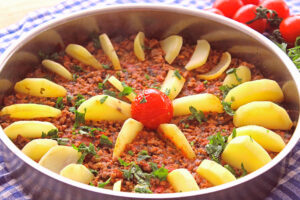 Kıymalı Patates Dizmesi Tanımı İçin MalzemelerPatates için:3 adet patates350 gram kıyma3 yemek kaşığı zeytinyağı3 diş sarımsak1 yemek kaşığı domates salçası1...