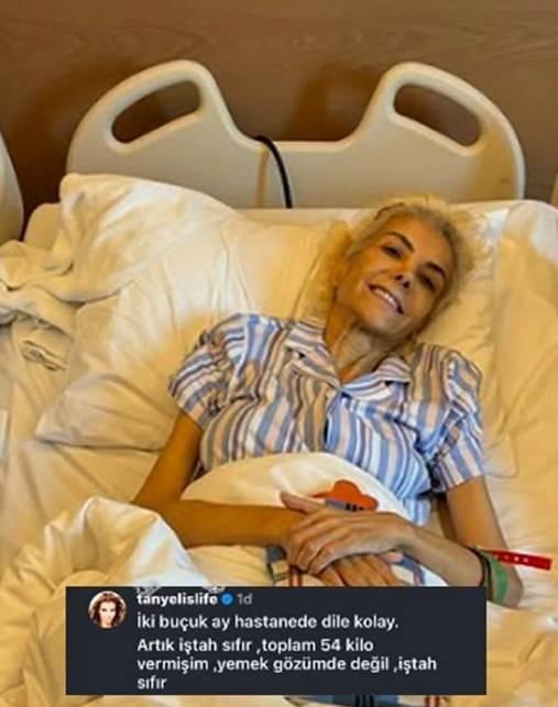 Sosyal medya hesabını etkin olarak kullanan ünlü isim, son paylaşımında iştahının büsbütün kapandığını belirtti. “2,5 ay hastanede lisana kolay. Artık iştah sıfır, toplam 54 kilo vermişim. Yemek gözümde değil, iştah sıfır” diyen Tanyeli’ye çok sayıda “Allah şifa versin”, “Bir an evvel toparlanırsınız inşallah dualarımız seninle” üzere yorumlar geldi.