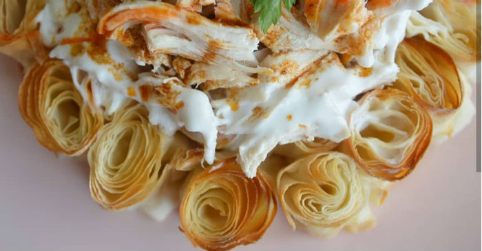 8. Daha sonra yoğurdu üzerine sürün didilmiş tavukları koyun. Servis edin. Afiyet olsun.