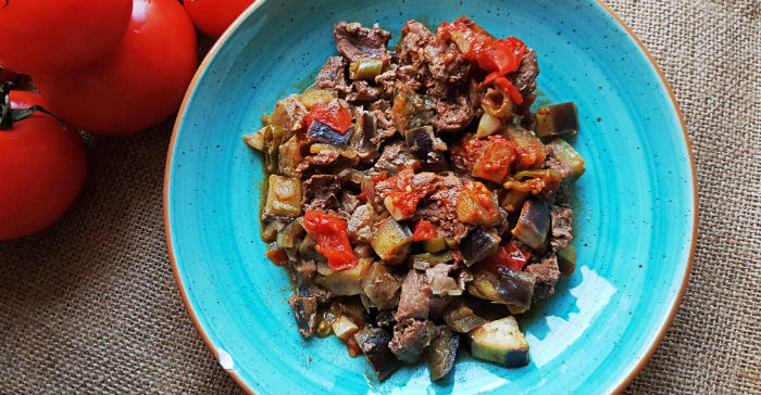 Etlerin üstüne kalan patlıcanları, biberleri ve sarımsakları serpiştirin. Bu etaplarda kat kat döşüyoruz ve karıştırmıyoruz.
