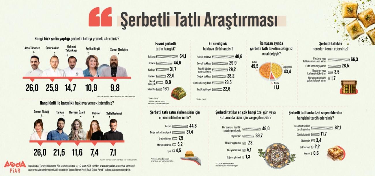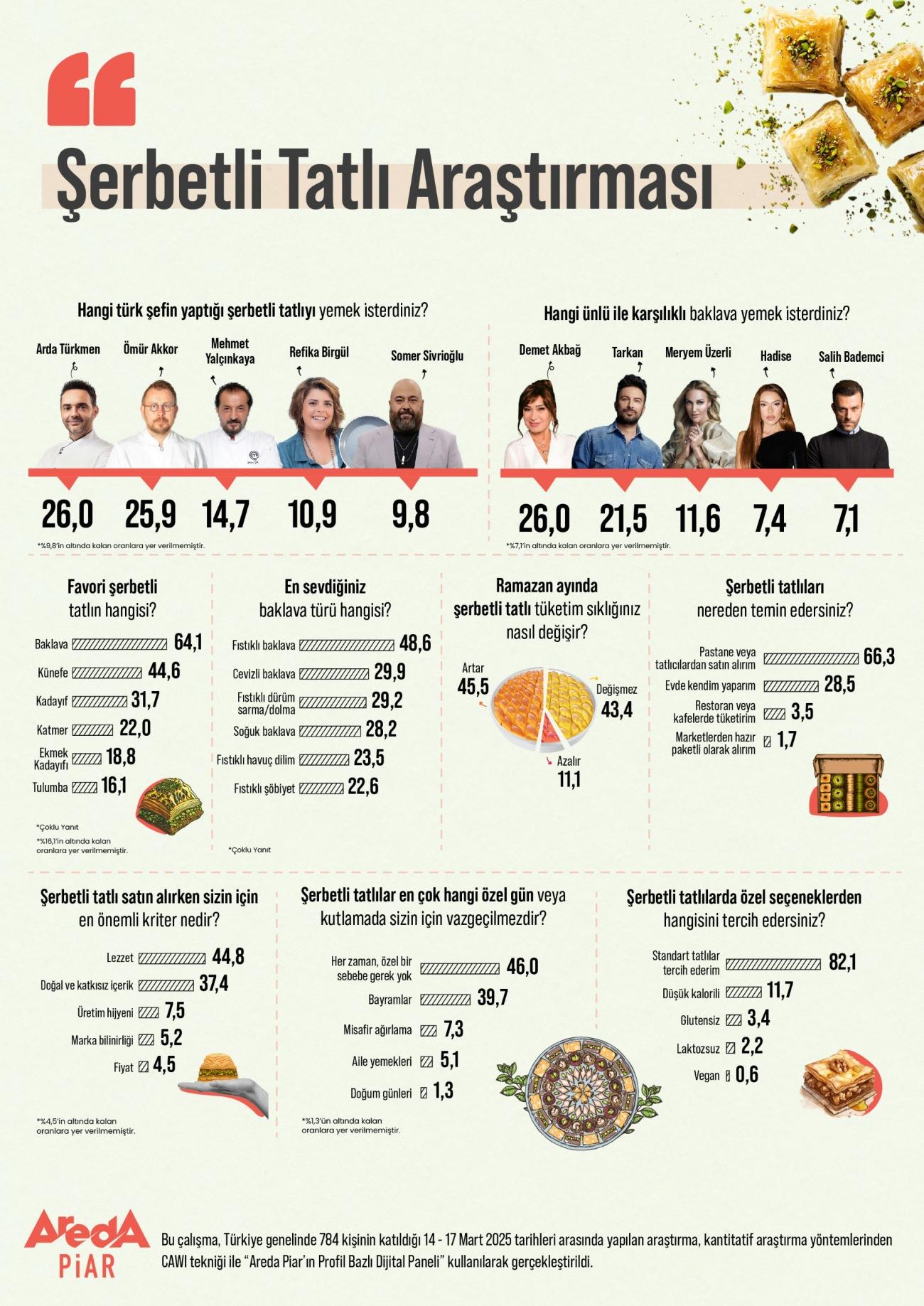 Areda Piar’ın Türkiye genelinde 14-17 Mart 2025 tarihleri ortasında gerçekleştirdiği Şerbetli Tatlılar Araştırması’na nazaran, Türk halkının en sevdiği şerbetli tatlı yüzde 64,1 ile baklava oldu. Çeşitleri ortasında fıstıklı baklava öne çıkarken, soğuk baklavanın da popülerliğini artırdığı görülüyor. “Hangi Türk şefin yaptığı şerbetli tatlıyı yemek isterdiniz?” sorusuyla Arda Türkmen (yüzde26,0) ve Ömür Akkor (yüzde25,9) öne çıkıyor. Türkiye’nin birlikte baklava yemek istediği ünlü isimler ortasında yüzde 26 ile Demet Akbağ birinci sırada yer alıyor.