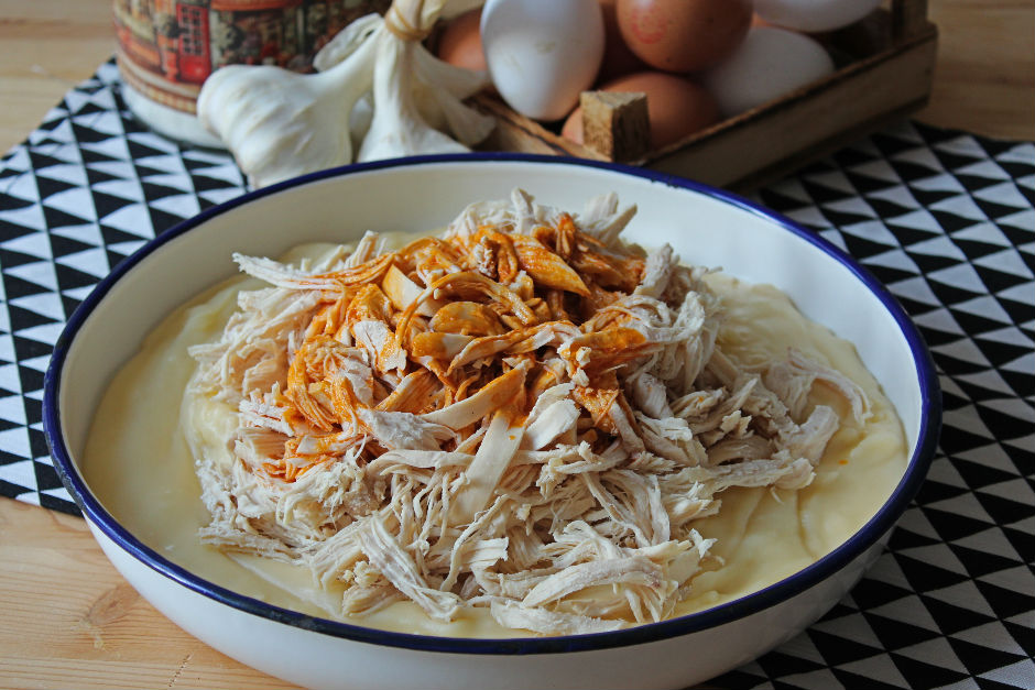 Pişirdiğiniz paçayı bir servis tabağına alın ve üstüne haşlanmış tavuk göğsünü didikleyin.