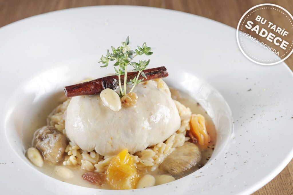 Soğuyan iç harcı incecik açılan kemiksiz tavuk but etinin içine sardıktan sonra koyu bir renk almaması için buharda pişirin. Dileğe nazaran evvelden hazırlanan arpa şehriye pilavı ve ayrıyeten sotelenmiş kuru meyveler eşliğinde sıcak olarak servis edin.