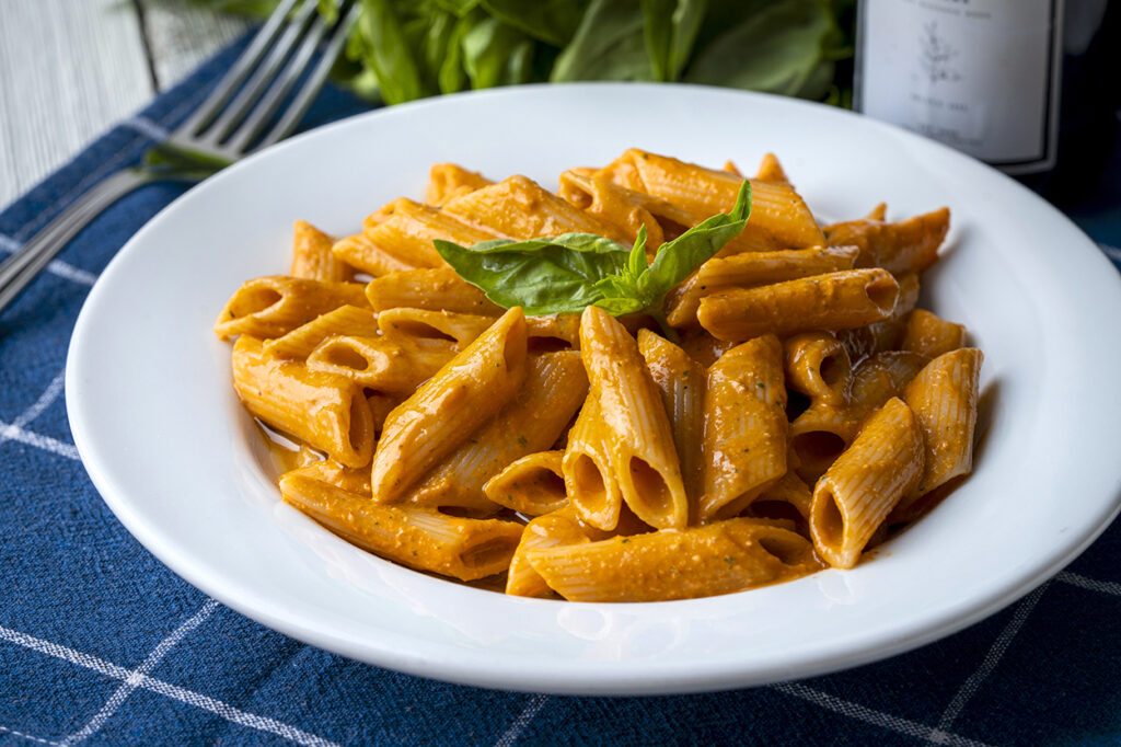 Biber pestolu makarna tarifimle, közlenmiş kırmızı biber, beyaz peynir ve fesleğenle hazırladığım lezzetli sosu penne makarnayla buluşturuyorum. Pratik ve enfes bir makarna tarifi!