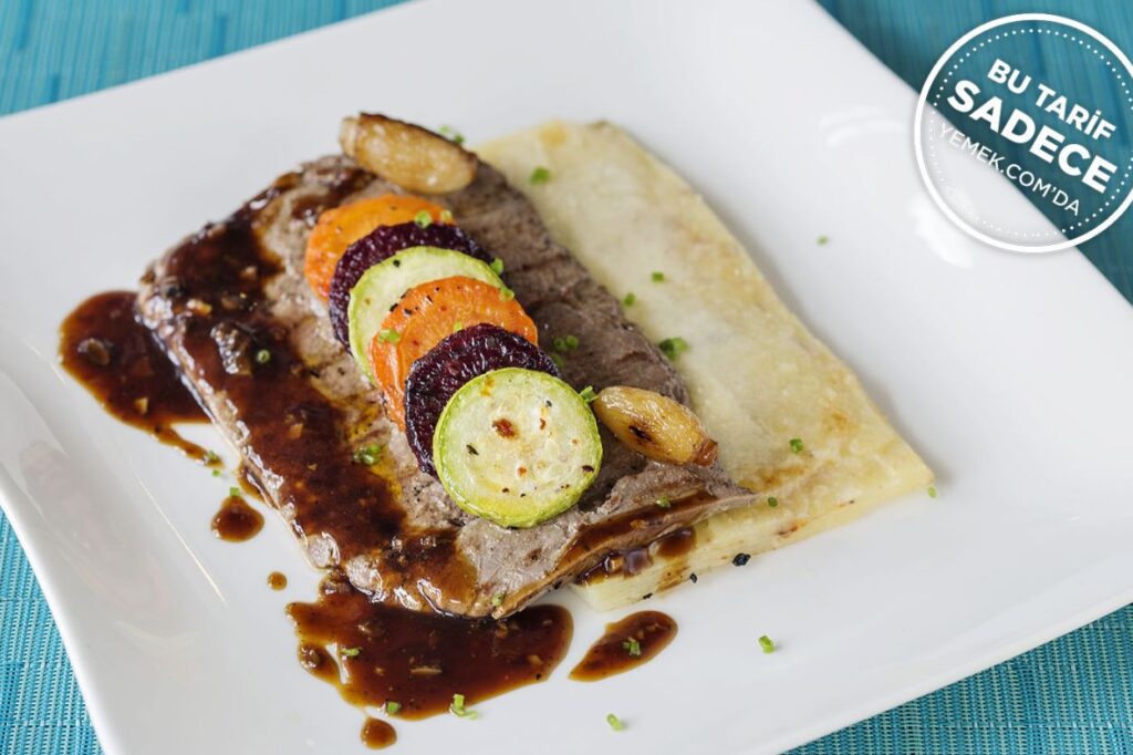 1 dakikada pişen et; inceltilmiş dana bonfile, üç katlı patates graten, fırınlanmış mevsim zerzevatları ve tane karabiberli konyak sostan oluşan bir tablo.