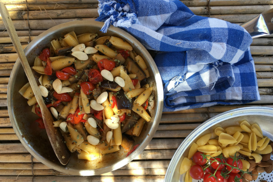Yaz esintilerini bol bademli, zeytinyağı ve mis kokulu kekik ile sofralarımıza taşıyan Datça yöntemi patlıcanlı makarna tanımı.