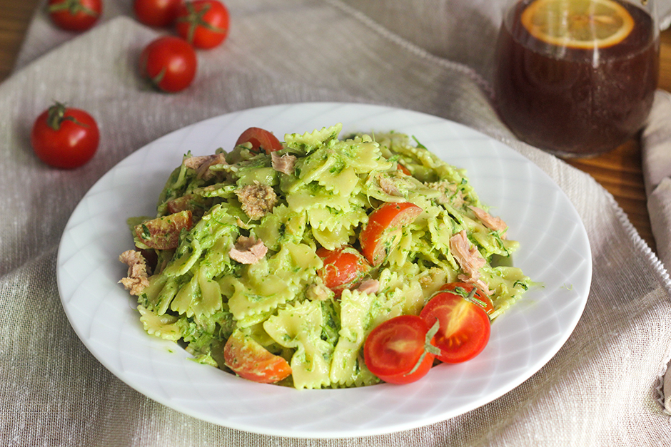 Maydanozlu pesto, ton balığı ve domatesin ahengine bir sefer daha şahit olduk! Lezzetten ödün vermeden doyuran makarna salatası burada!