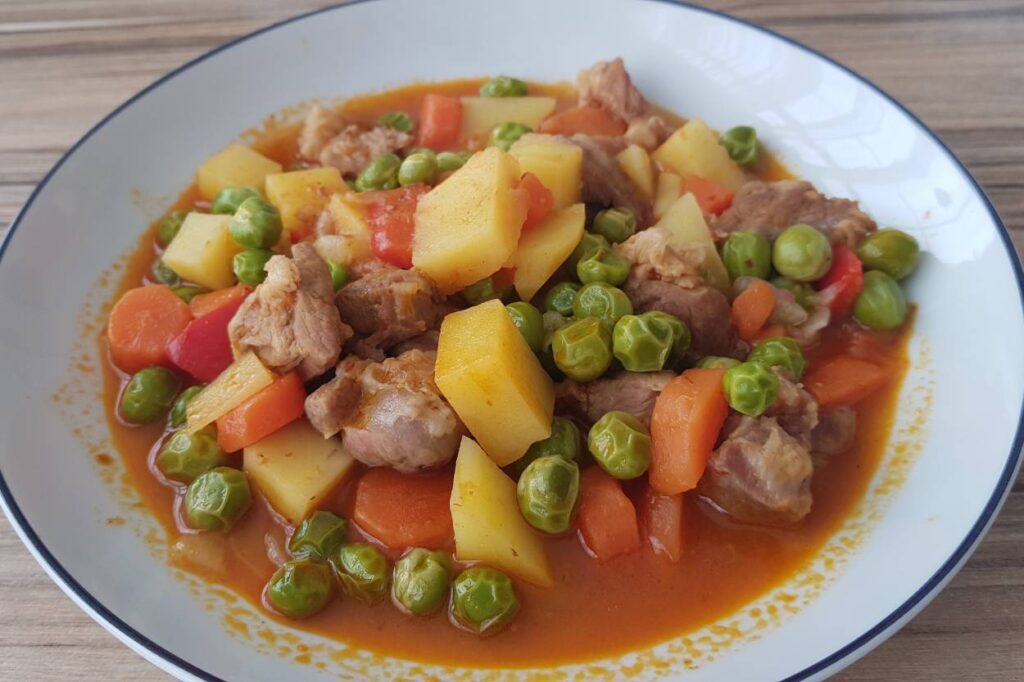 Üzerine salçalarımızı ekleyip kokusu çıkana kadar kavurup, bezelye ve patateslerimizi, baharatlarımızı ve 2 bardak su daha ekleyip kısık ateşte kapağı kapalı 15-20 dakika daha pişiriyoruz. Afiyet olsun.