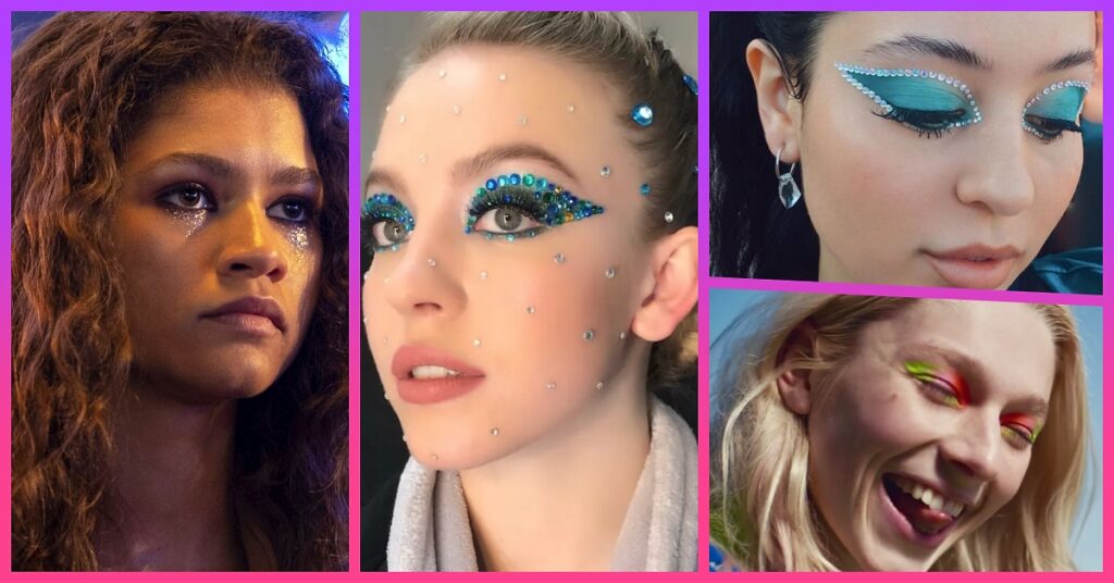 Göz makyajında ışıltı hâlâ popüler; Euphoria dizisinden esinlenen parlak gölgelere olan ilgi sürüyor. Göz çevresine ince taşlar veya simli dokularla yapılan süslemeler dikkat çekiyor ve bu trendin yankısı gün yüzüne çıkıyor.