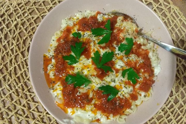 8. Tabaklanan makarna ile sos ve yoğurt birleştirilir. Afiyet olsun.