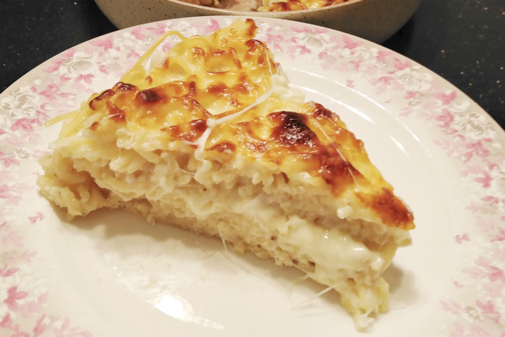 Üzerine kalın dilimlenmiş lisan peynirini yerleştiriyoruz. Kalan makarnayı ekliyoruz. Beşamel sosun kalanını da üzerine döküyoruz.