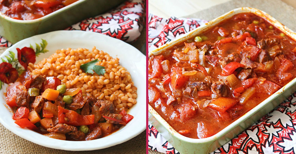 Ardından soğanları ekleyip, soğanlar pembeleşene dek kavurmaya devam edin. Akabinde biberleri ve salçaları ekleyin, ve salçanın kokusu çıkana dek kavurun. Domatesleri de ekledikten sonra, son olarak kenara ayırdığınız et suyunu da ekleyin ve 10 dakika bu halde pişirin. Tuz ve karabiberi de ekleyip, güzelce karıştırın.