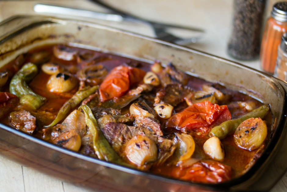 Isıya güçlü cam fırın kabına etleri yerleştirin.