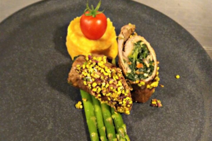 Fırından çıkardığınız etin kenarından parçalamadan kesin ve dışındakileri çıkarın. Eti dömi glace sosa bulayıp dışını fıstıkla kaplayın.