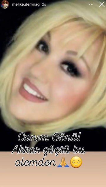 Akkor’un vefatıyla adeta yıkılan sanatçı dostu Melike Demirağ, toplumsal medya hesabından paylaşım yaparak “Canım Gönül Akkor göçtü bu alemden” notunu düştü.