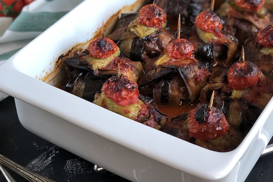 4. Fırından çıkan patlıcanlar artı şekli verilerek dizilir, ortasına köfte konulur ve patlıcanlar kapatılır.
