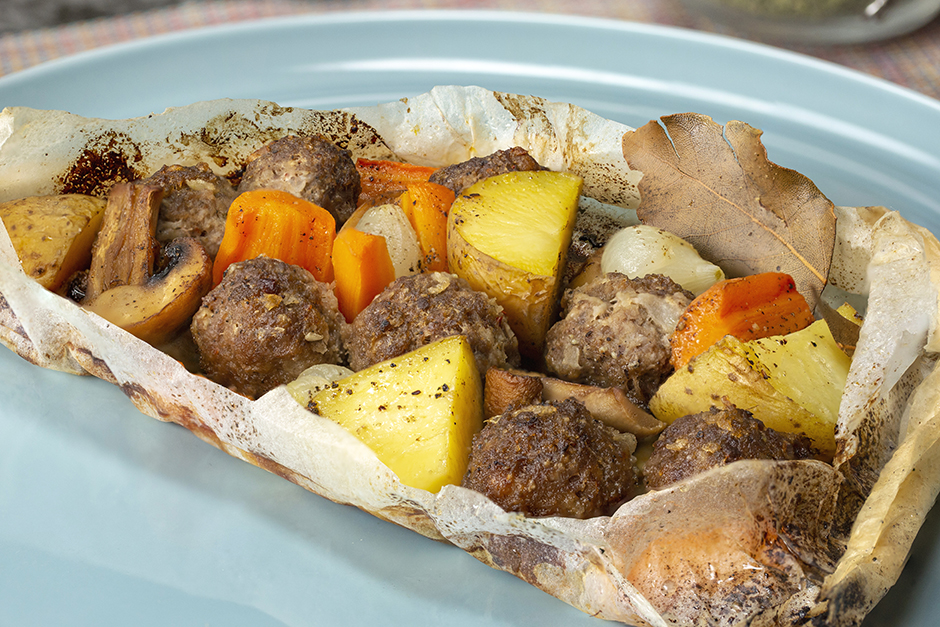 200 derece fırında yaklaşık 30 dakika kadar pişirin. Kağıtta sebzeli köfteniz servise hazır!