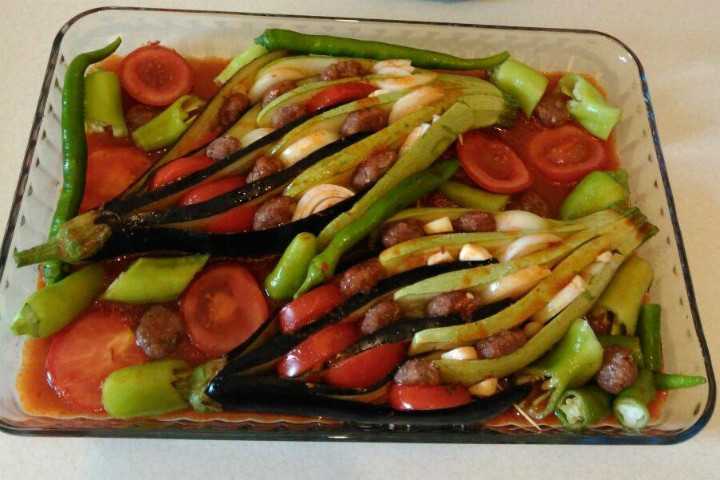 Doğradığımız başka soğan, sarımsak, domates ve biber ile birlikte patlıcan ve kabağı birleştirdikten sonra hoş bir biçimde dizilir.