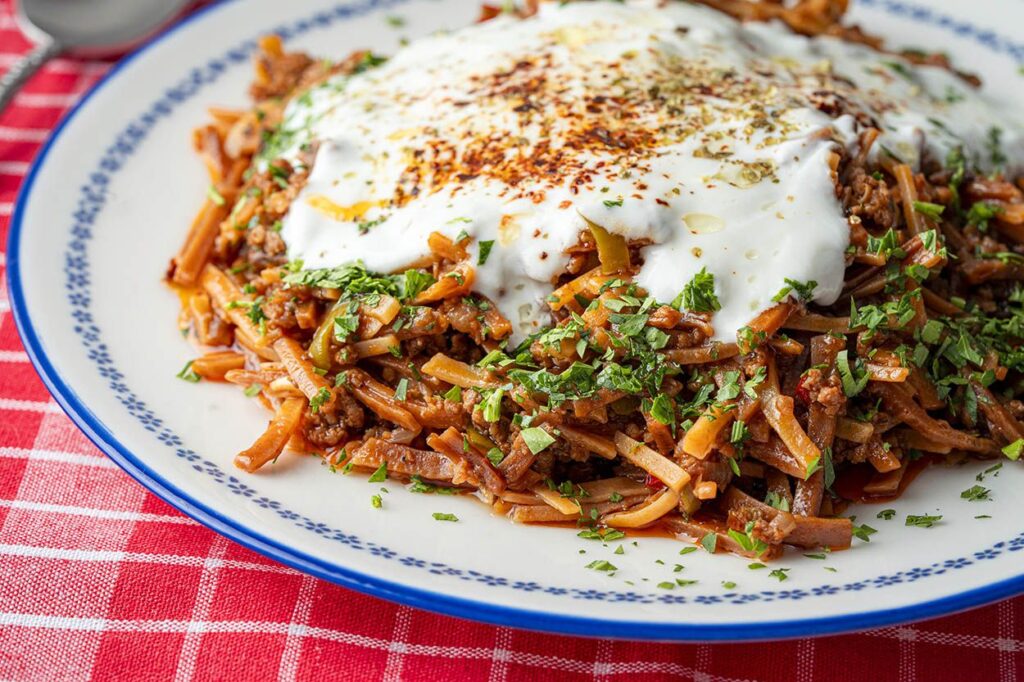 Kıymalı eriştenizi sıcakken servis tabaklarına alıp çırpılmış yoğurt, kıyılmış maydanoz ve baharatlarla servis edin. Afiyet olsun.