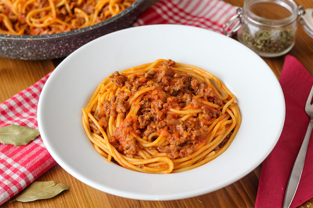 Haşlayıp süzmüş olduğunuz spagetti makarnayı kıymalı sosun içerisine alıp güzelce karıştırın. Tavayı ileri geri hareket ettirerek sosa daha uygun bulanmasını sağlayabilirsiniz. Sos ve makarna birleşene dek dikkatlice karıştırarak pişirmeniz kâfi olacaktır.