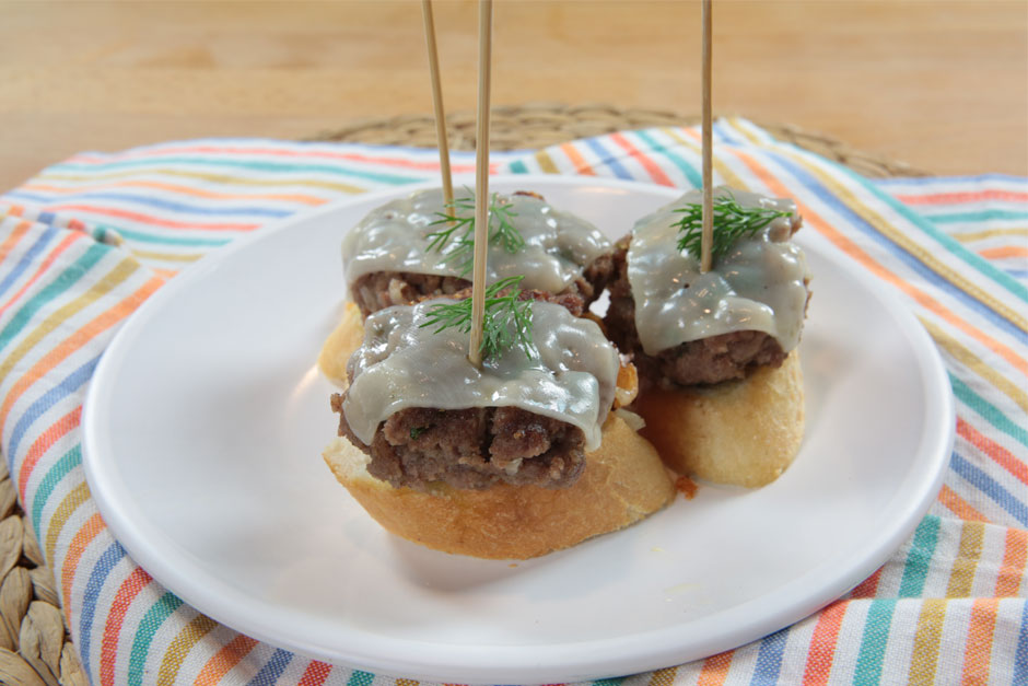 Köfteli kanepe tanımıyla minik atıştırmaklıklar hazırlamak çok kolay. Sarımsaklı ekmek dilimleri üzerinde köftelerin lezzetine eriyen peynir eşlik ediyor.