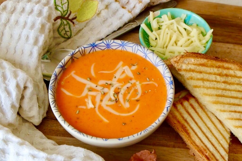 Yalnızca yarım bardak sütle, salçasız, kremasız, mis kokulu bir domates çorbası yapıyoruz. Üzerine kaşar rendesi de çok yakışıyor.
