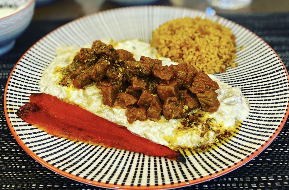 5. Tabağımıza evvel yoğurtlu patlıcanımızı, sonrasında üzerine etimizi koyuyoruz. Afiyet olsun.