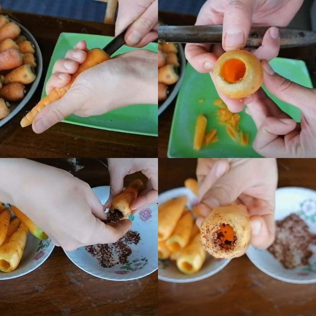 1’er tatlı kaşığı pul biber, tuz ve karabiberi bir kapta karıştıralım. Havuçlarımızın içini biberleyelim.