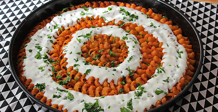 7. Fırından aldığınız mantı makaranın üstüne sarımsaklı yoğurdu gezdirin ve ince doğranmış maydanozla süsleyip servis edin. Afiyet olsun.