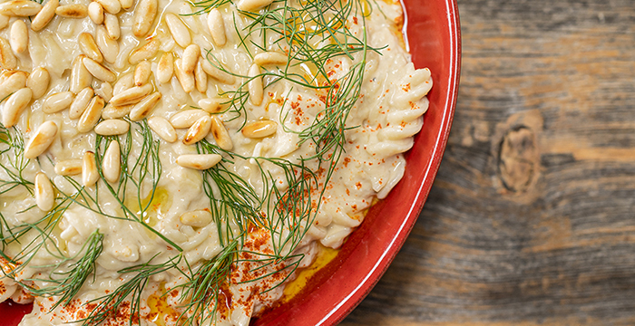 8. Makarnanın üzerine dereotu yaprakları, kavrulmuş fıstıklar, toz kırmızı biber ve zeytinyağı gezdirip servis edin. Afiyet olsun.