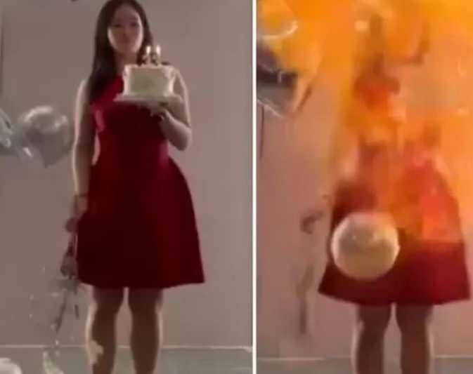 Vietnam’ın başşehir Hanoi’de Giang isimli bayanın doğum günü kutlaması makûs bitti. Giang’ın doğum günü kutlaması sırasında elinde tuttuğu pastanın mumları öbür elindeki hidrojen dolu balona temas edince patlama meydana geldi.