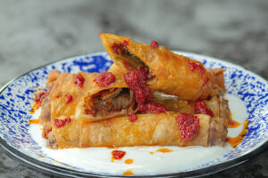 Çardak Kebabı Tanımı İçin Malzemeler1 adet yufka (8 üçgene bölünmüş)250 gram dana antrikot (küp doğranmış)2 adet yeşil biber (doğranmış)1 yemek...