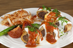 Bonfile Sarma Tanımı İçin Malzemeler8 dilim bonfile eti (inceltilmiş, dövülmüş)4 adet biber (renkli biberler kullanılabilir)2 adet soğan5 adet büyük uzunluk...