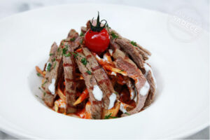 Çentik Kebabı Tanımı İçin Malzemeler150 gram dana bonfile2 yemek kaşığı ayçiçek yağı1 adet büyük uzunluk patates1 yemek kaşığı domates salçası1/2...