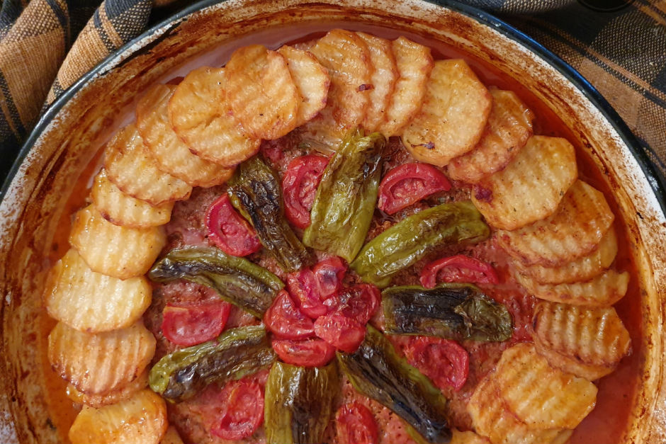 4. Uygun bir tepsiye kıymalı harcınızı hoş bir biçimde yayın elinizle bastırın. Yaydığınız kıymanın kenarlarına patates dilimlerini yerleştirin. Domates dilimleri ve biberle üzerini süsleyin.