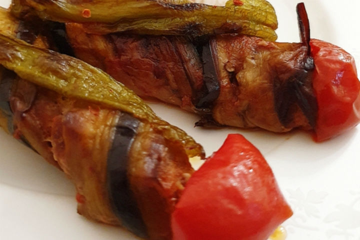 Bir dilim patlıcanı düz bir tabana serin ve üzerine köfteli çöp şişler bırakarak rulo formunda sarmalayın.