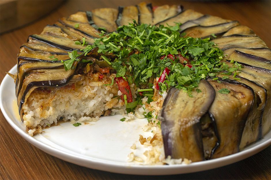 Pirinç pilavının da tamamını kalıba döküp düzelttikten sonra kenarlardan sarkan patlıcanları ğst tarafa hakikat kapatın. Kenara ayırdığınız 4-5 adet patlıcan ile boşluk kalan yerleri kapatın.