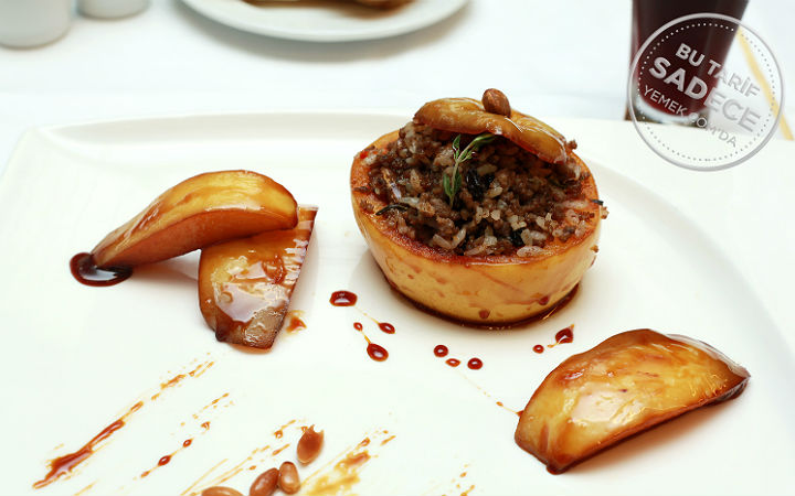 Pekmezli ayva dolması tanımında, kuzu kıymalı ve baharatlı iç harcı ile doldurulan büyük uzunluk ayvalar pekmez ilavesiyle fırınlandıktan sonra servis ediliyor.