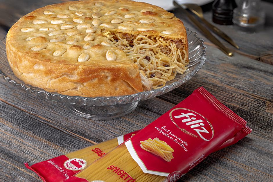 14. Pişen makarnayı, kelepçeyi açıp büyük bir servis tabağına zıt çevirin ve dilimleyerek sıcak olarak servis edin. Afiyet olsun.