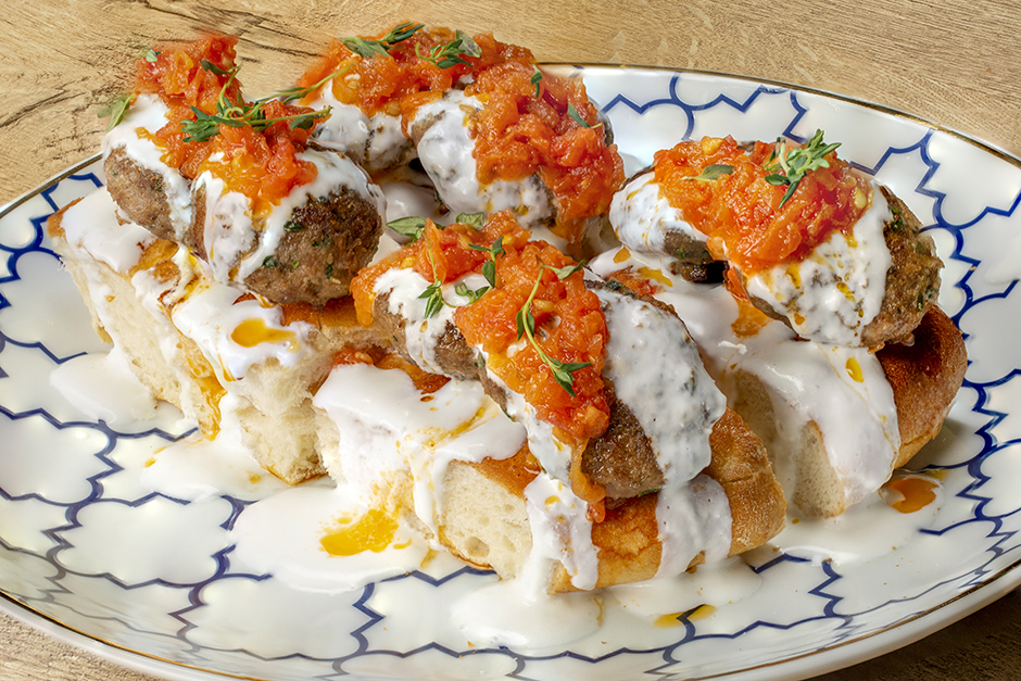 Ardından pidelerin üzerine köfteleri yerleştirin ve çırpılmış yoğurdu köftelerin üzerine eşit bir formda dökün.