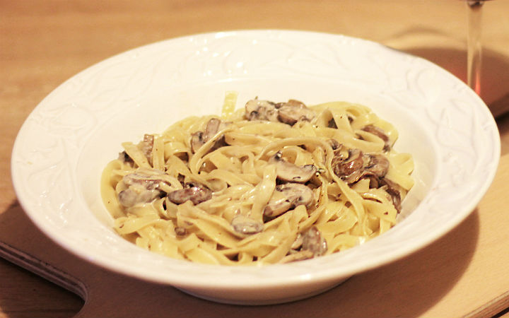 Fettucine gibisi, 5 mm. genişliğinde ince kesilmiş, yumurtalı hamur şeritlerinden yapılan tagliatelle makarna rokforlu ve mantarlı sosuyla servis ediliyor.