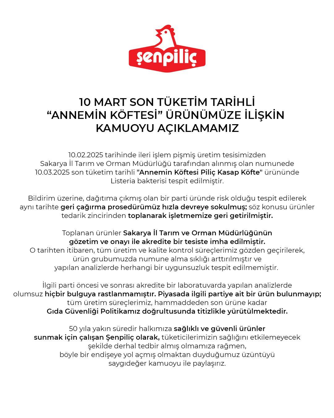 Yapılan kontroller sonrasında Şenpiliç’in Annemin Köftesi isimli piliç kasap köftesinde önemli sıhhat meselelerine sebep olan L-monocytogenes bakterisi tespit edildi ve yaklaşık 1 ay evvel toplatma kararı alındı.