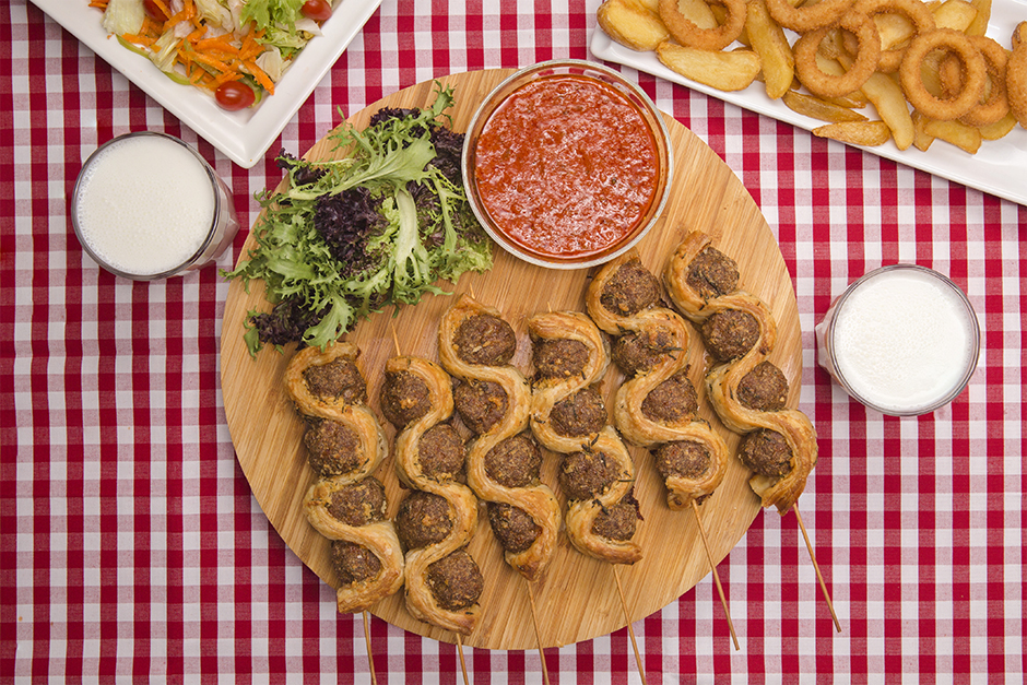 Elinize bir adet şiş alın ve evvel milföyü batırıp, 1 adet köfteyi geçirin. Hamur, köftelerin üzerinden zigzag olacak formda geçirin.