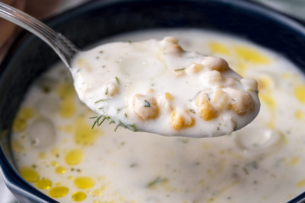 3. Çorbaya haşlanmış nohutlar, ince kıyılmış dereotu, kuru nane ve buz ekleyip hazır hale getirin.