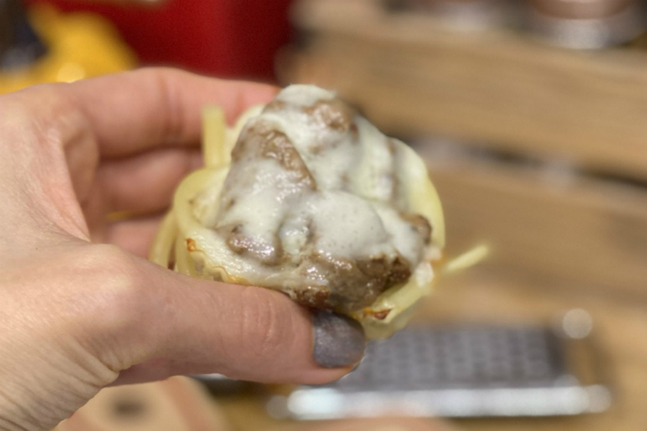 4. Soğumuş makarnalar cupcake kalıplarına yerleştirilir ve yapışıp tutması için ufak kesilmiş kaşar peyniri tam ortasına konulur.