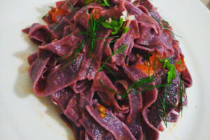 Ev Üretimi Mor Fettuccine Tanımı İçin MalzemelerHamuru için:225 gram un110 gram irmik3 adet yumurta1,5 yemek kaşığı zeytinyağı6-8 gram tuz30 gram...