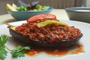 Fırında Karnıyarık Tanımı İçin MalzemelerPatlıcanlar için:2 adet orta boy patlıcan2 yemek sıvı yağ400 gram orta yağlı kıyma1 adet büyük boy...
