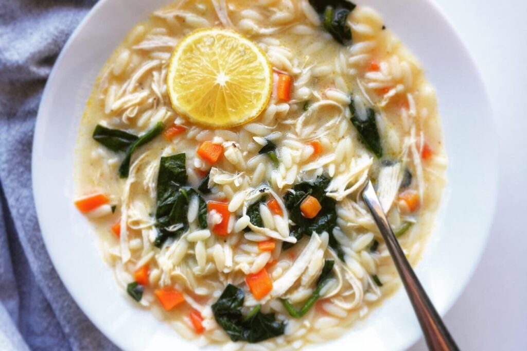 İçinde soğan, havuç, ıspanak ve arpa şehriye var. Terbiyesi ise yumurta sarısı, limon ve bol karabiberli…Karşınızda: Tavuk Suyuna Şifa Çorbası.