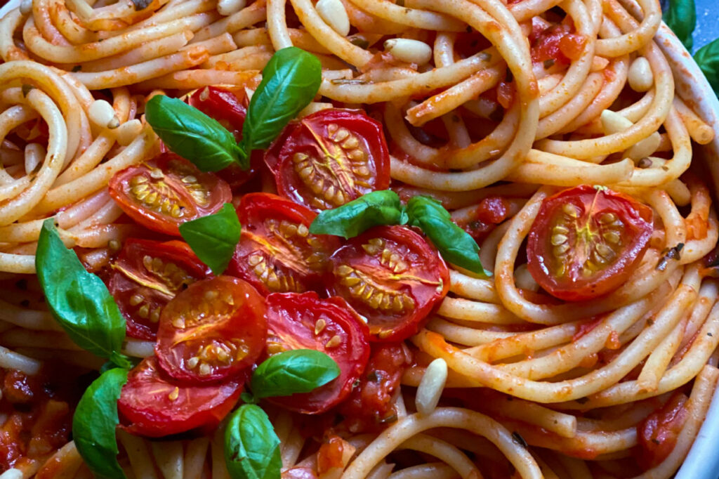 Sosumuz 3-4 dakika daha kaynadıktan sonra makarnaları ek edelim, üzerine çam fıstığı ve fırınlanan çeri domateslerimizi ekleyelim. İşte bu kadar, afiyet olsun.