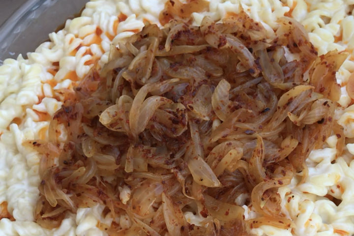 5. Servis tabağına aldığımız yoğurtlu makarnanın üzerine tereyağlı soğan sosumuzu ekliyoruz. Afiyet olsun.